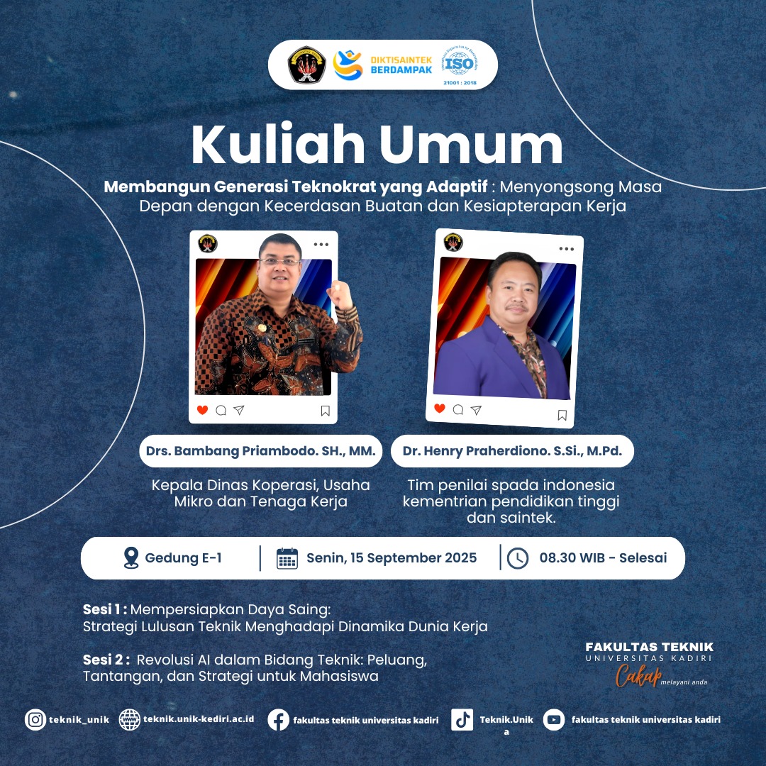 | Nama Kegiatan | Kuliah Umum “Membangun Generasi Teknokrat yang Adaptif: Menyongsong Masa Depan dengan Kecerdasan Buatan dan Kesiapan Kerja” |