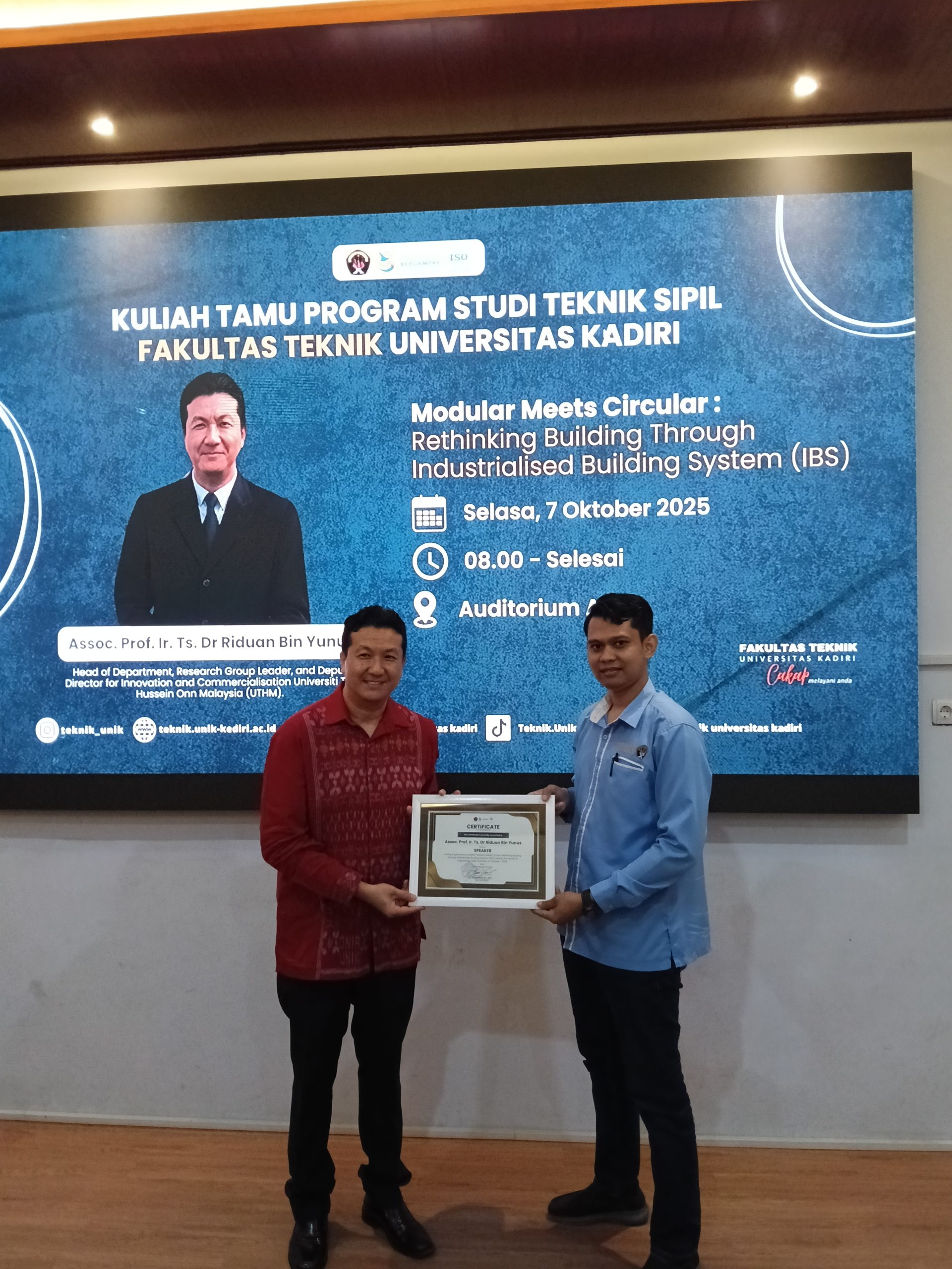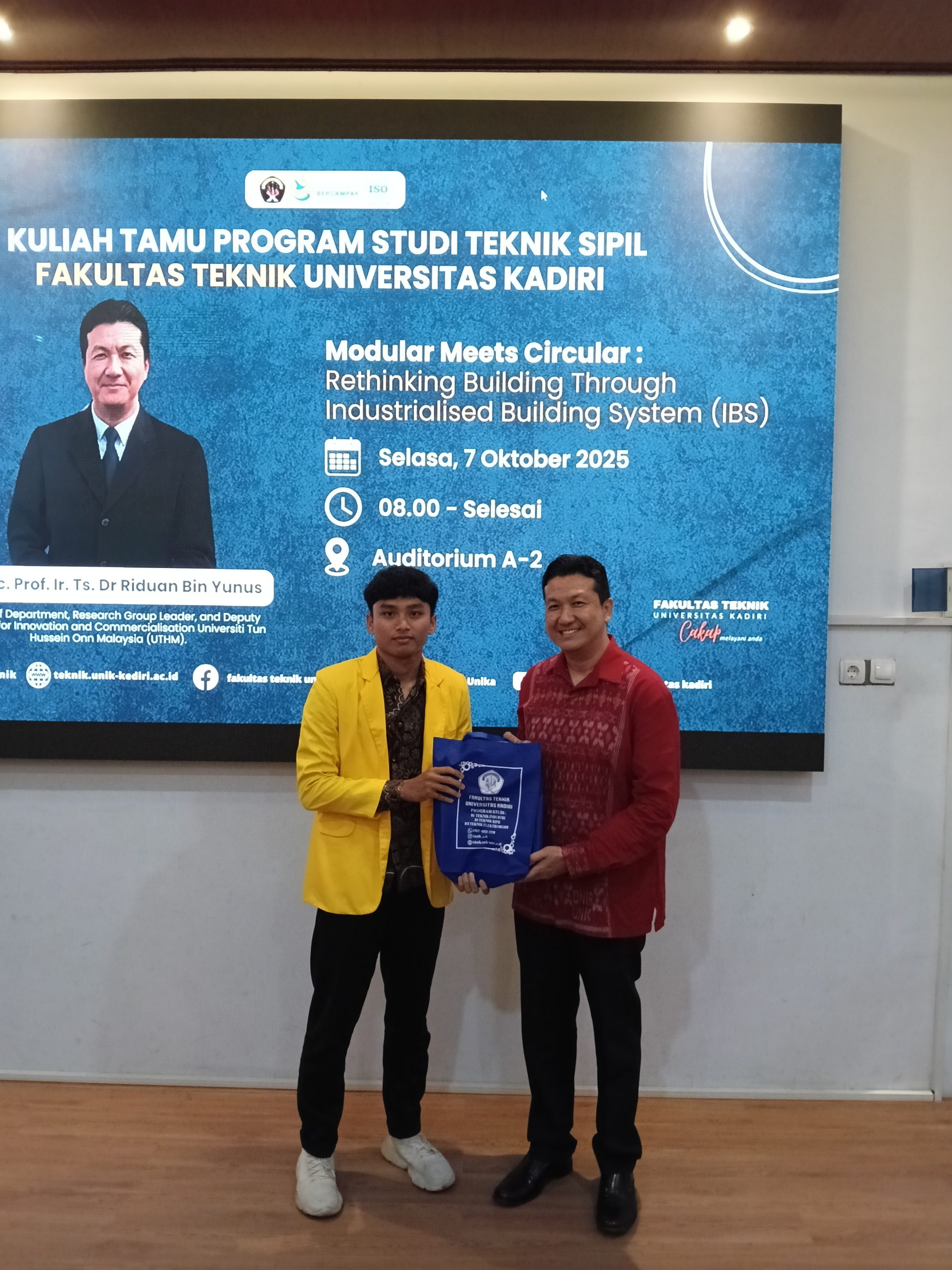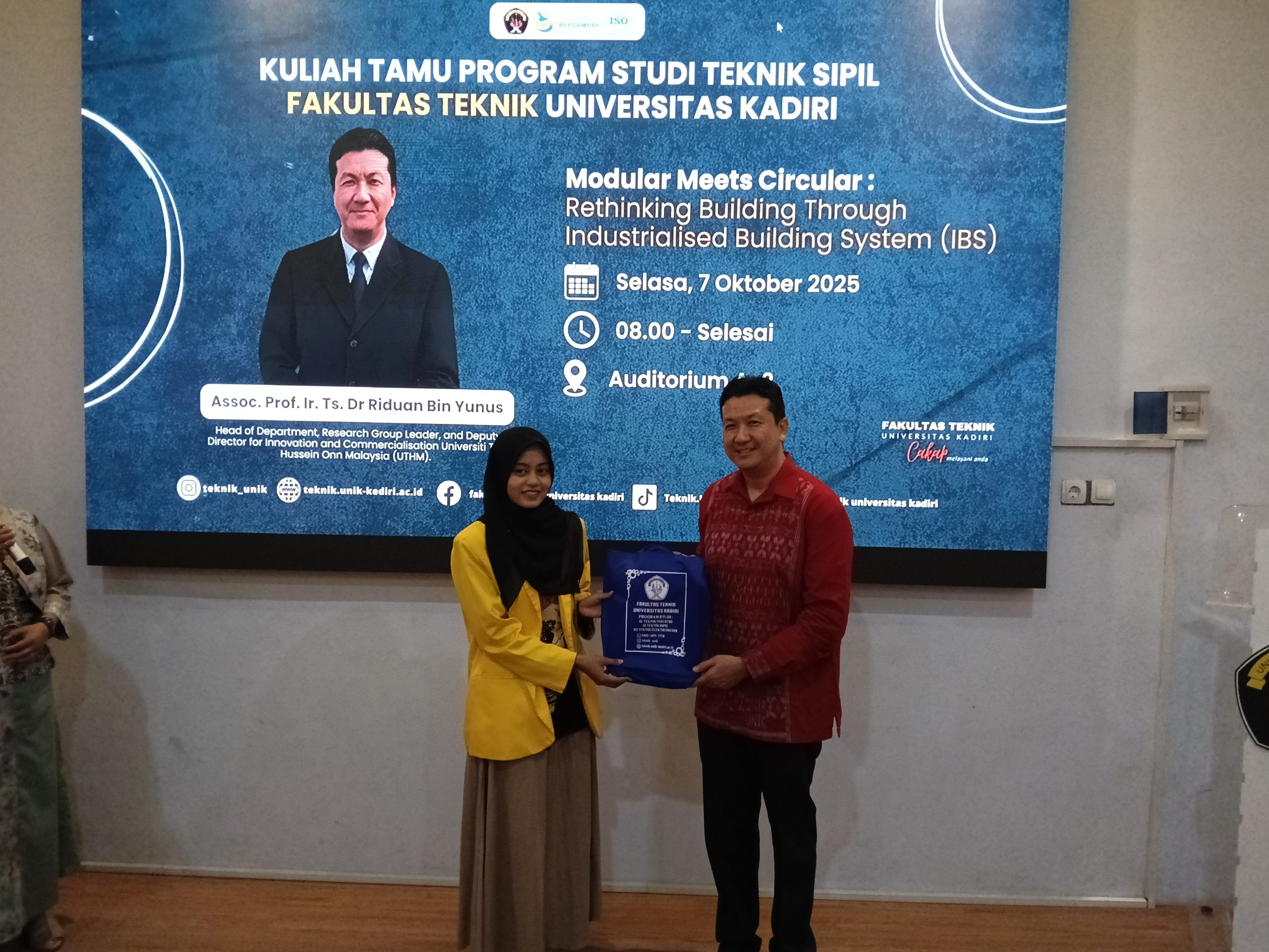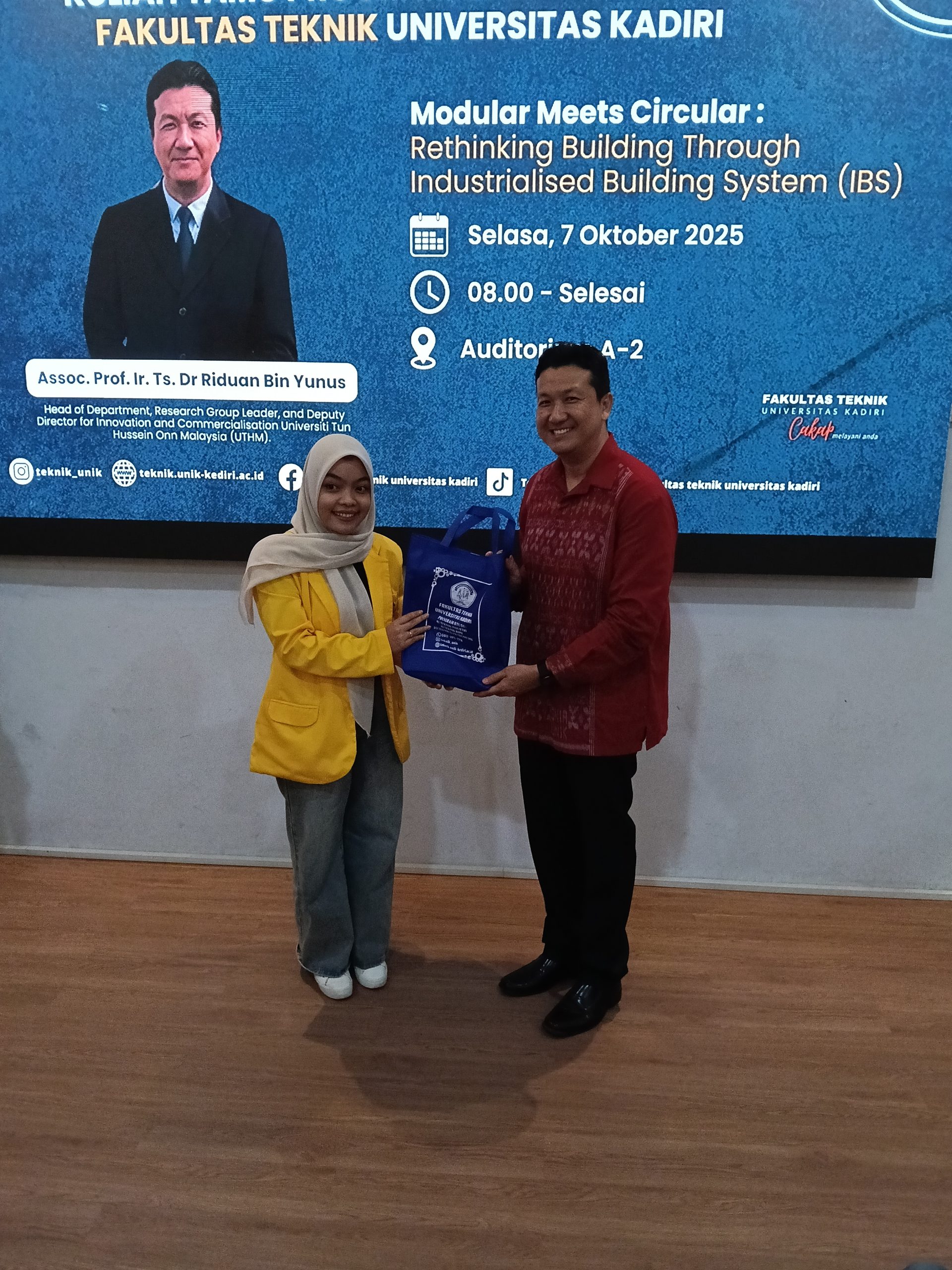 Kediri, 7 Oktober 2025 – Program Studi Teknik Sipil, Fakultas Teknik Universitas Kadiri menyelenggarakan kuliah tamu bertajuk “Modular Meets Circular: Rethinking Building Through Industrialised Building System (IBS)” pada Selasa, 7 Oktober 2025, bertempat di Auditorium A-2 Universitas Kadiri.