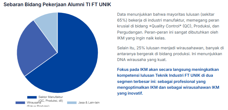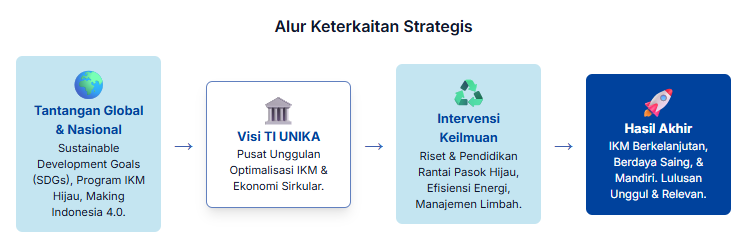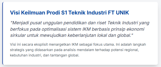 Dengan visi ini, lulusan Teknik Industri FT UNIK tidak hanya dicetak untuk mengisi posisi seperti Quality Control dan Produksi di industri, tetapi juga menjadi agen transformasi dan wirausaha yang mampu membangun IKM masa depan yang lebih efisien, kompetitif, dan berkelanjutan.